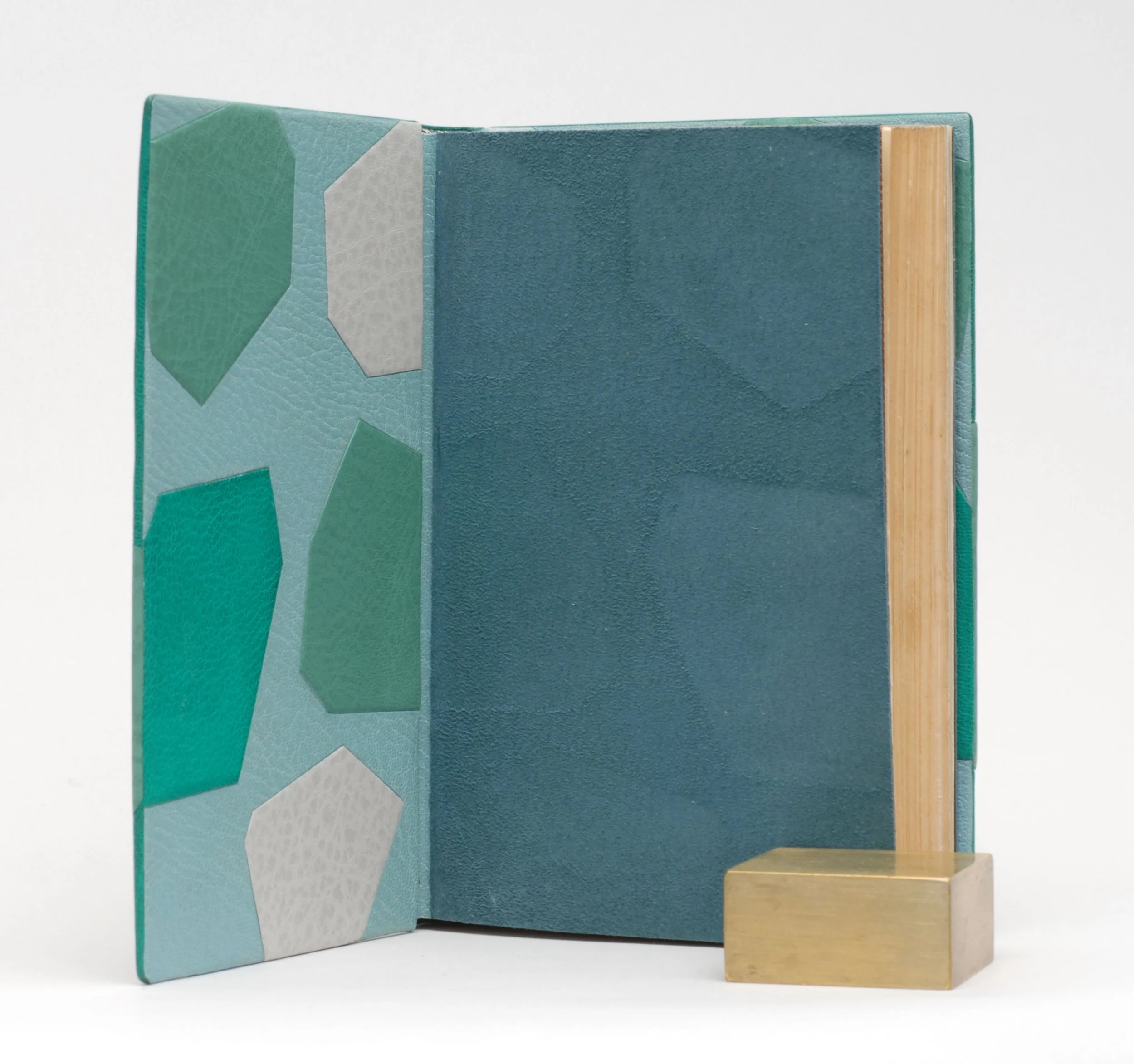 Full goatskin fine binding: text disbound, outer folios guarded and resewn on flattened cords laced into boards. Buffalo and calf vellum inlays, and back-pared and traditional onlays. Blind tooling and title. Hand-sewn, French-style silk endbands, graphite head. Cloth from original, damaged case bound in at front and rear. Ruscombe Mill handmade paper endsheets. Impression of onlays on edge-to-edge goatskin doublures offsets onto suede flyleaves. Public domain images of historic shipwrecks inkjet printed, then laminated behind vellum. Bound 2014.